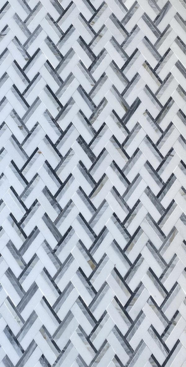 MB321 BASKET WEAVE CHEVRON THASSOS + BLUETTE + BARDIGLIO 11.74″ X 10.77″ = .88 SF PER SHEET