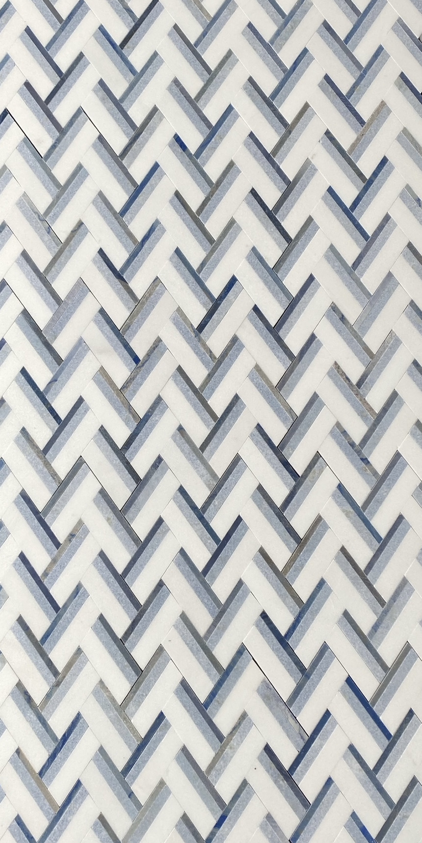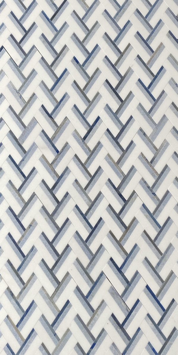 MB322 BASKET WEAVE CHEVRON THASSOS + BLUE CELESTE + AZUL MACAUBA 11.74″ X 10.77″ = .88 SF PER SHEET