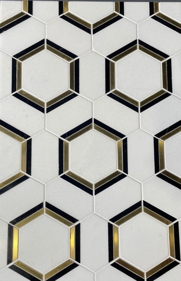 MB606 SPLENDOR HEX DOUBLE BORDER THASSOS & NERO MARQUINA & BRASS POLISHED 12.13”x10.51” = .89 SF PER SHEET