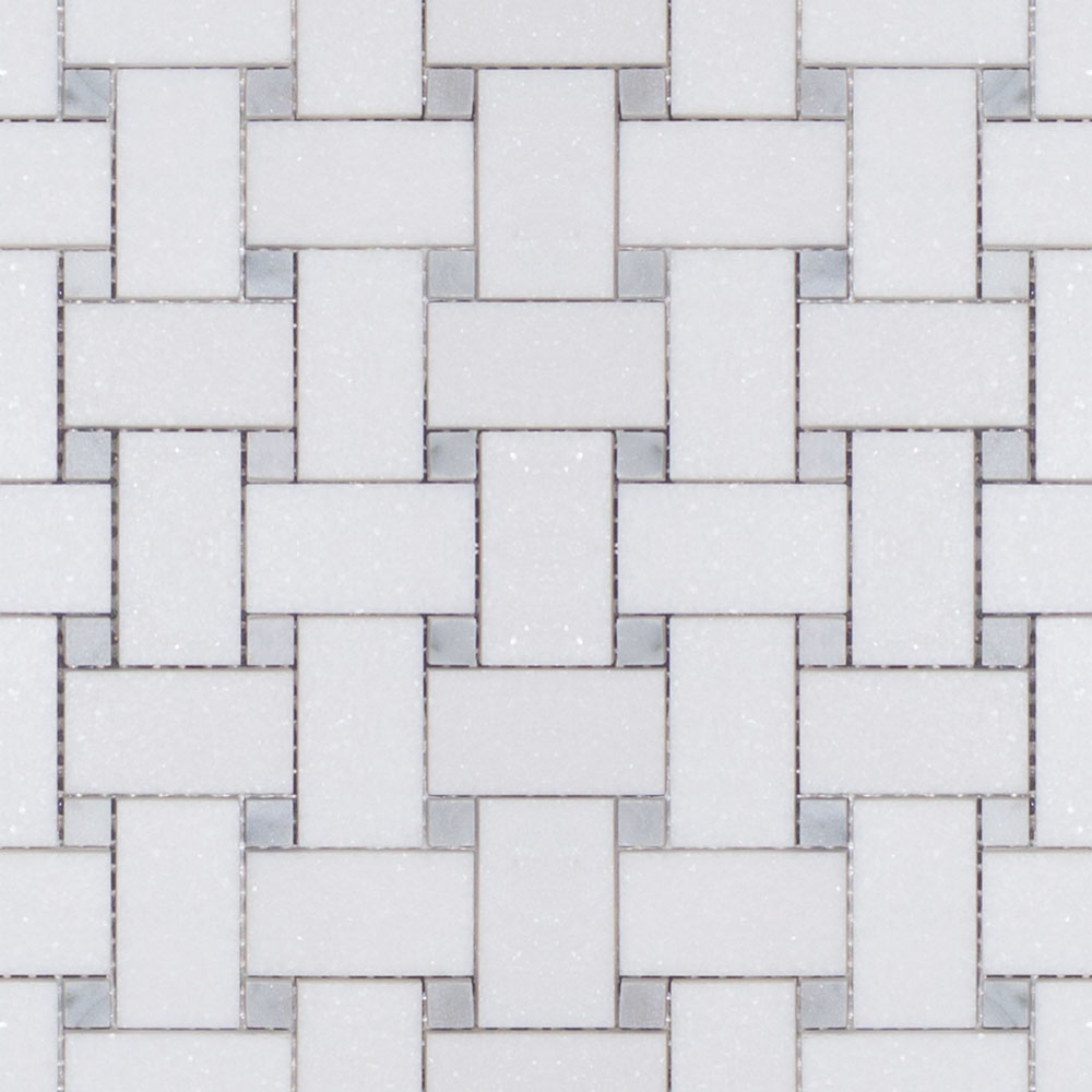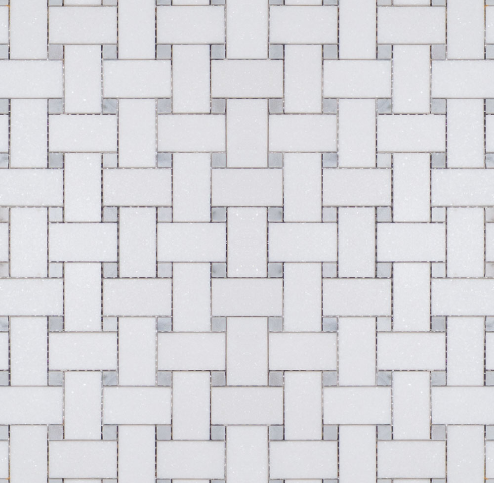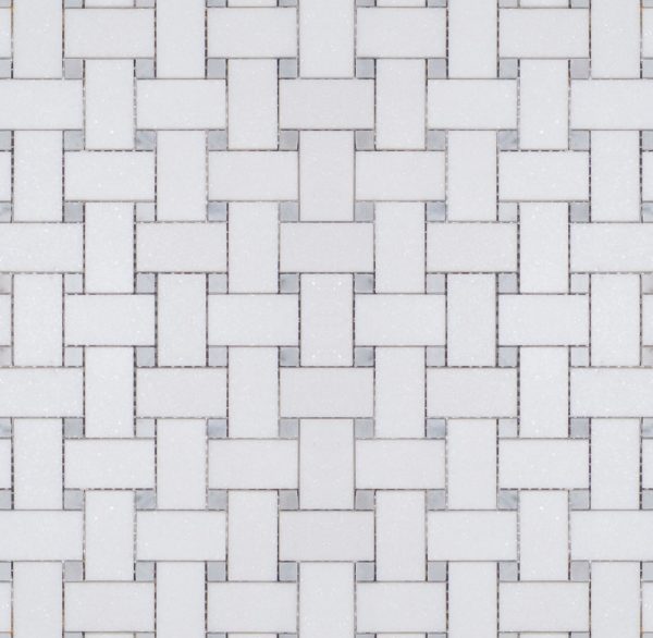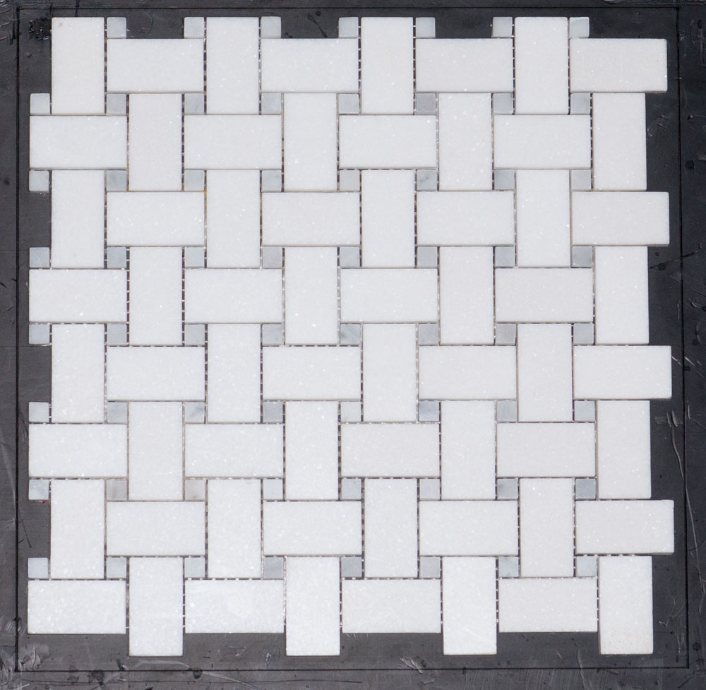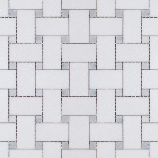 MBW115 MEDIUM BASKET WEAVE WITH 1MM GAP THASSOS+CARRARA DOT POLISHED SHEET SIZE 12.12″ X 12.12″ =1.02SF/ PER PCS SOLD BY THE PCS