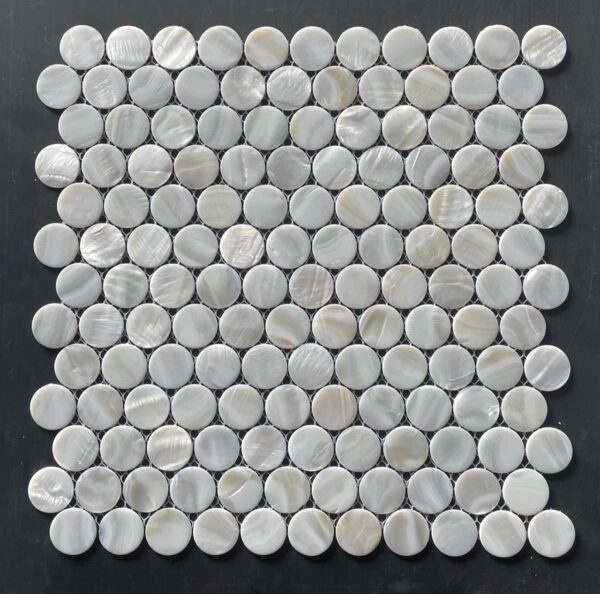 PWJ02-025 1″ ROUND SUPER WHITE PEARL 2MM JOINT ON MESH 12X12 = 1SF SOLD BY THE SHEET