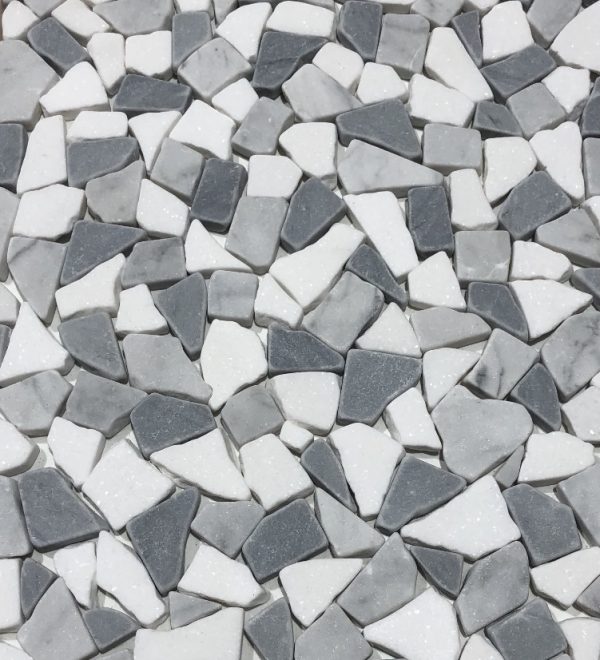 RIVERROCK BLENDS (TUMBLED) THASSOS, CARRARA, BARDIGLIO 11 1/16″ X 11 1/16″ = 0.85 SF PER SHEET MESH MOUNTED
